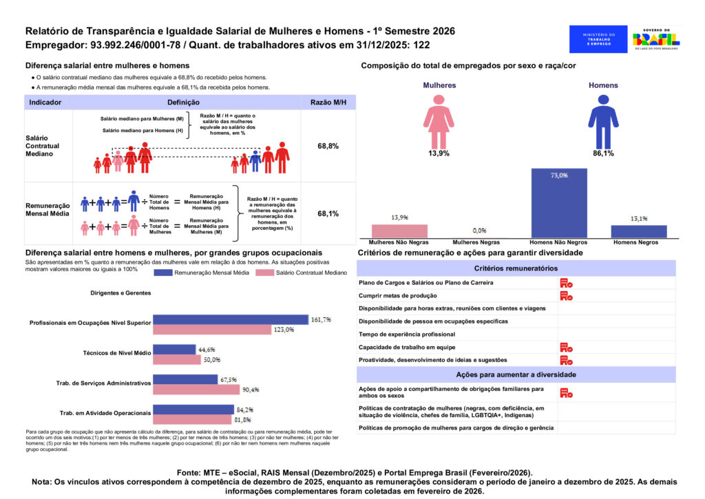 Apresentamos os dados do nosso Relatório de Transparência e Igualdade Salarial referentes ao primeiro semestre de 2026. Esse documento faz parte do compromisso da empresa com a equidade no ambiente de trabalho.